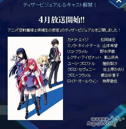 日本小說家諸星悠原作、甘味みきひろ負責插圖的輕小說作品「空戰魔導士候補生的教官」(富士見Fantasia文庫)自從2013年7月20日發售第一卷以來受到了不少讀者的好評。早在之前就報道過了本作將要動畫化的消息,目前本作已經確定將于2015年4月開始播送,並公開了8位主要角色的CAST。