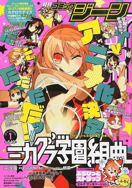 由LastNote.原作,明菜負責插畫的輕小說「禦神樂學園組曲」(ミカグラ學園組曲)在月刊ComicGene2015年1月號雜志封面上偷跑了本作TV動畫化的好消息!而原本預定在今晚日本時間21時nico生放送上將直播「禦神樂學園組曲」的特番節目,並且將有重大新聞發表。不過,既然雜志圖透已經偷跑TV動畫的消息,nico直播的重大新聞也就沒什麼懸念了吧?