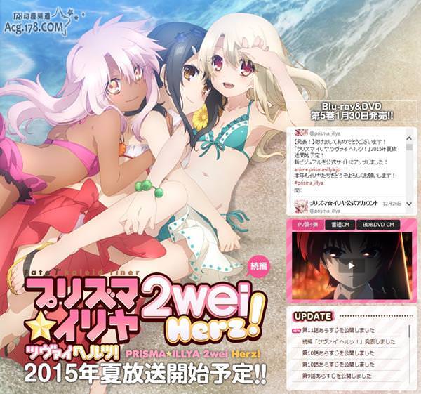 近日,在本作動畫的官網上,公布了「Fate/kaleid liner魔法少女☆伊莉雅 2wei Herz!」的新消息。本作將定于今年夏季開始播出,官網上也更新了伊莉雅她們在海邊的泳裝圖片。