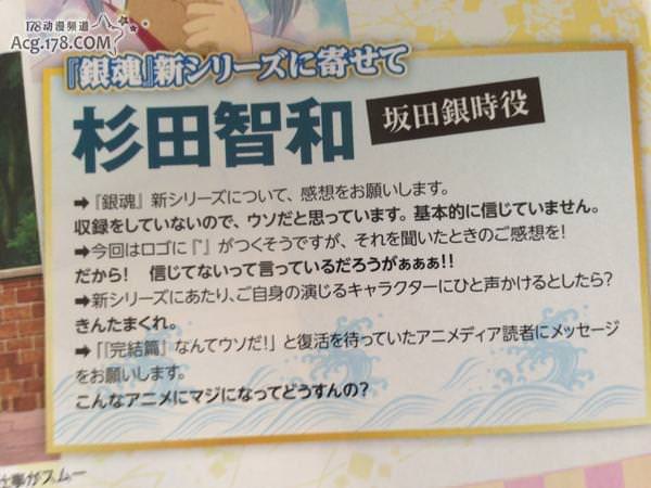 在「JUMPfesta 2015」上,公布了「銀魂」將于2015年春季,再次TV動畫化的消息。近日,Animedia推出了一本「銀魂」特集,書中除了對故事的介紹,還包括了記者對「銀魂」演職人員的采訪與光盤的發售等的消息。其中,為「銀魂」中坂田銀時配音的杉田智和在接受采訪時說了十分有意思的話。