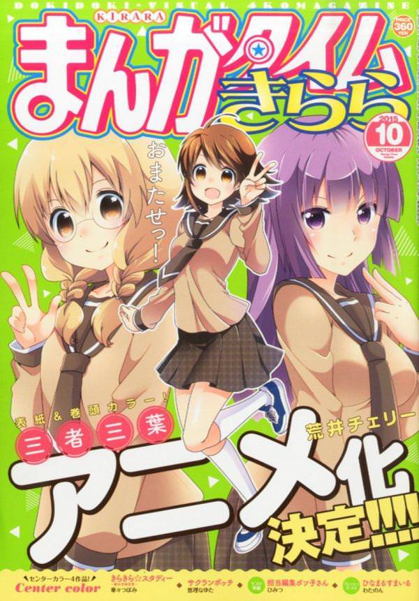 根據偷跑圖消息,預定將于9月9日發售的漫畫雜志《閃亮漫畫時間(原名:まんがタイムきらら)》10月號(芳文社)會在封面上宣布四格漫畫《三者三葉》動畫化的消息。