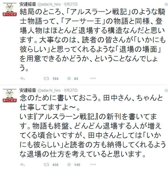 “為防萬一,我先寫下吧。田中先生正在好好地工作哦~現在正在創作《亞爾斯蘭戰記》的新刊。劇情進入了尾聲,現在也是退場的人逐步增加的時候了,就田中先生而言,他也會考慮‘如何以自己的方式’來創作讓讀者能夠接受的領便當方式。”