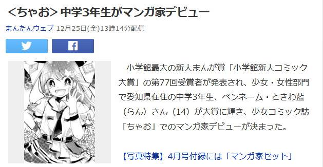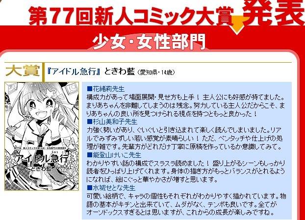 這名14歲的女生目前居住于愛知縣,而筆名是“ときわ藍”,她的獲獎作品為《偶像急行》(「アイドル急行」),故事講述了偶像組合“偶像急行”的主人公為了成為center而奮斗的故事。對此評委表示:“畫風非常可愛,角色的個性也十分鮮明。我們非常期待她今後的成長。”“劇情很簡單,讓人一口氣看下去了!另外關鍵劇情也很好地抓住了讀者。”