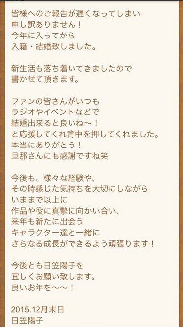 日笠陽子今天更新的個人博客前半部分都是談自己的工作,後半部分話鋒一轉就宣布自己早前已經正式結婚,日笠陽子在博客中感謝經常在廣播和節目活動中希望自己能夠結婚的粉絲,也感謝老公,陽子姐姐說自己一直在真摯的對待作品和角色,希望明年也會遇到更多新作品和新角色,日笠陽子並未透露自己的老公是否為一般會社員。