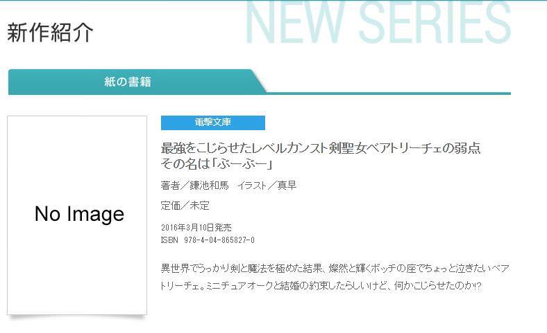 鐮池和馬的新作輕小說名字是《最強をこじらせたレベルカンスト剣聖女ベアトリーチェの弱點 その名は「ぶーぶー」》,而在這部標題長出新境界的小說中,女主角是貝雅特麗齊,小說的插畫為真早,真早和鐮池和馬之前在《智慧村的座敷童子》這部作品時就有合作。