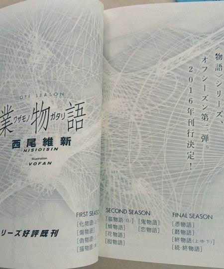 西尾維新的“物語系列”真是永無盡頭啊,在《續·終物語》之後讀者們就已經做好了與此系列告別的心理准備,沒想到西尾維新卻繼續寫出了OFF SEASON系列的第1彈《愚物語》,而第2彈《業物語》則將于2016年內出版。