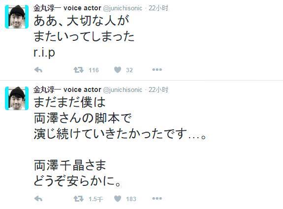 金丸淳一在推特上公布說:“我還希望能夠繼續出演兩澤女士的劇本啊……兩澤千晶女士,希望您一路走好。啊啊,那麼重要的人離開了。r.i.p”由于是業界人士的說法,因此有著很高可信度。而向來在 twitter 上活躍的福田己津央從 18 號後就再也沒有更新過一條 twitter 更加大了其妻兩澤千晶去世的真實性。