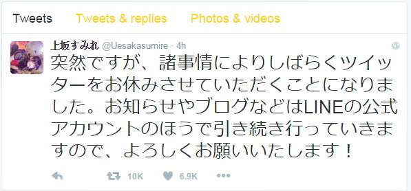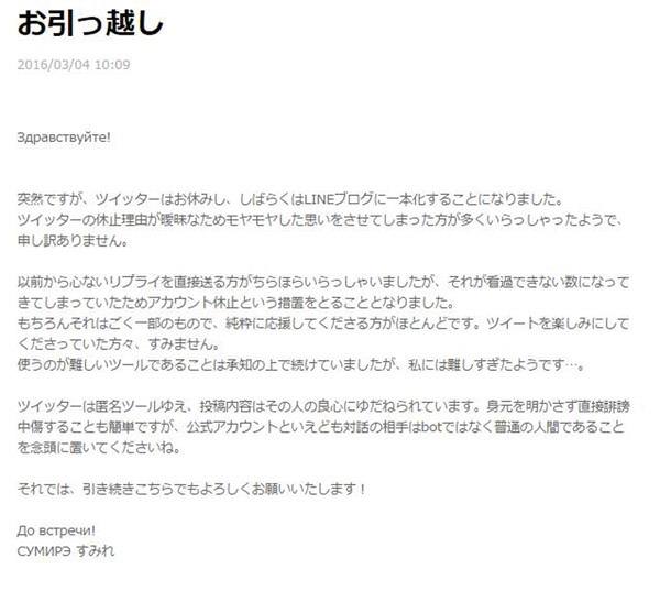 今天上坂政委在自己的博客中解釋了一下自己停止 twitter 活動的原因:「以前就有很多不長心的人直接在 twitter 下面回複我,但最近這種惡意的回複數量已經不能忽視了,因此決定停止 twitter 帳號的活動,當然這些惡意回複只是一小部分,更多的回複都是大家對我的支援聲,這次對于 twitter 上的大家十分抱歉,雖然我知道 twitter 用起來挺難的,但對我來說似乎是太難了,twitter 是一個匿名工具,發布的內容完全依賴于用戶的良心,即使不公開自己的真實身份而對別人誹謗中傷也是件很容易的事,希望大家能夠記住官方帳號的背後不是個機器而是一名活生生的人。那麼在博客這邊還請大家多多關照」。
