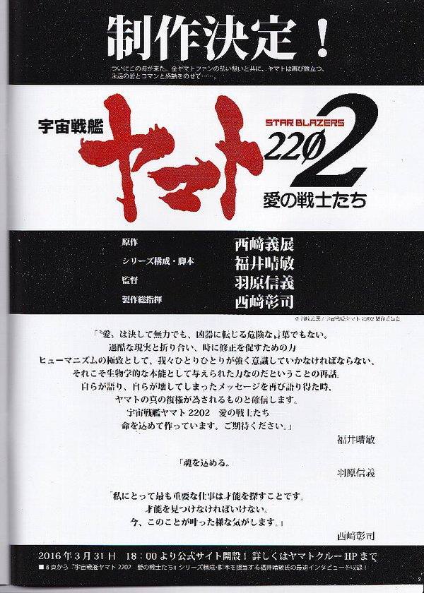 這次的劇場版監督由羽原信義擔任,(蒼穹法芙娜系列動畫的監督),系列構成由 UC 獨角獸小說原作者福井晴敏擔任,而根據視覺圖來看大和號已經沒有了之前的風采,之前官方說 2199 的續作在 2016 年下半年播出,看來在今年的 10 月新番中又可以看見大和號了。