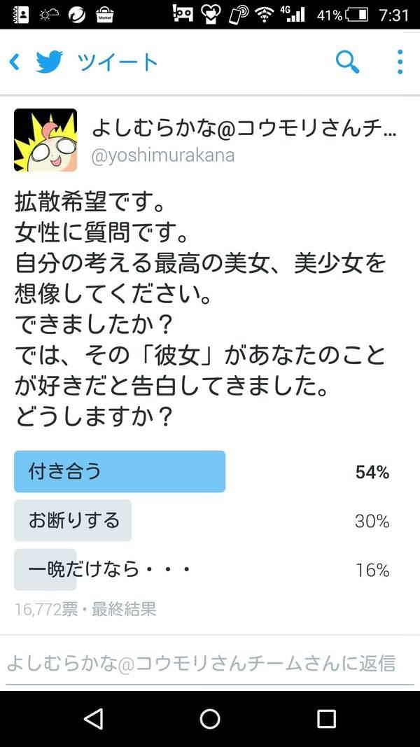¡¡¡¡¡¡¡¡¡¡¡¡¡¡¡¡¡¡¡¡如果現實中出現你心目中理想的帥哥美女或美少年(女)向你告白,在彼此都是同性別的情形下你會願意和對方交往嗎?日本網友為了印證英國艾塞克斯大學的研究,在推特上分別針對男女雙方舉辦這項投票。而結果也相當耐人尋味,大致上可以看出男女性對同性親密接觸的容忍度有很大的差異。