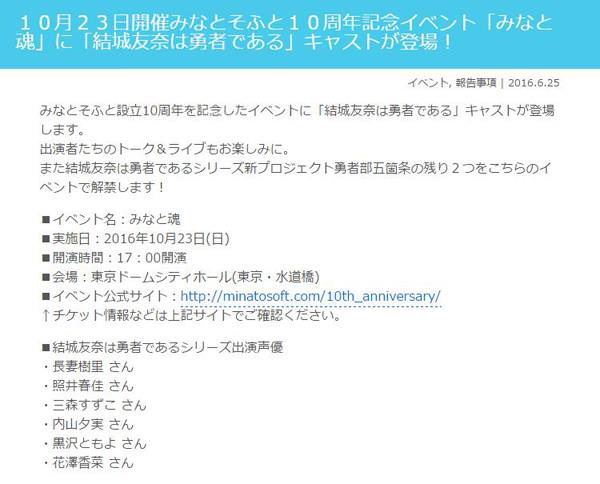 在6月24日公開的MinatoSoft十周年紀念活動頁面上,官方發表了《結城友奈是勇者》的最新消息,預定在10月23日舉辦的MinatoSoft十周年EVENT將包括七大活動,其中一個便是將在EVENT上一舉公布“新PROJECT勇者部五條約”中剩下的2個,並且表示不會是PC游戲化。