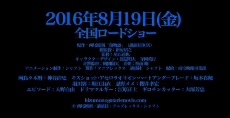 此前一直疑似跳票的《傷物語》劇場版第二部熱血篇于昨天在Animat 店鋪正式公開了將于8月19日上映的宣傳看板,SHAFT這次並未爽約也沒挖坑實現了2016年夏天第二部上映的承諾,熱血篇的故事中將會是阿拉垃圾君與追捕小忍的吸血鬼獵人之間戰斗的故事,聽到預告中垃圾君痛苦的大喊為什麼心中莫名的爽。