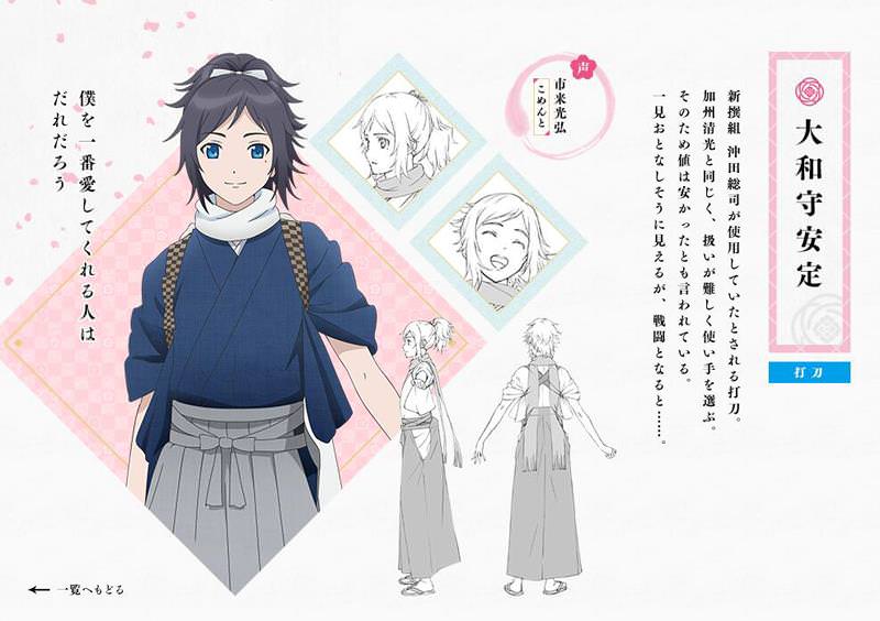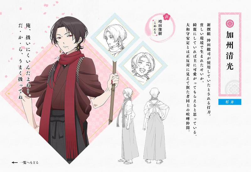 此前在Anime Japan的商業日,官方宣布《刀劍亂舞》將分別由動畫工房,Ufotable分別制作兩部動畫,動畫工房版的動畫將在今年10月新番播出,Ufotable版的動畫將在2017年播出,近日,由動畫工房制作的《刀劍亂舞-花丸-》陸續公布了三位角色人設。
