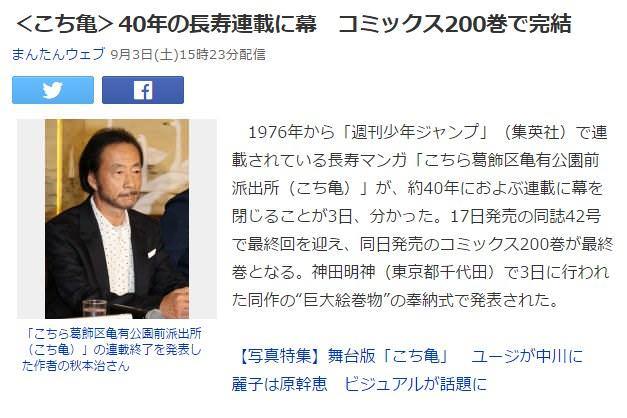 《烏龍派出所》從1976年開始在《周刊少年JUMP》上連載,而在9月17日發售第200卷也將是作品的最後一卷。在談到完結的事情時,作者秋本治表示:“能夠連載40年,對作家而言是值得開心的事情。我其實是想一直畫下去的。不過這次不是徹底就結束了,偶爾可能還會去JUMP玩玩的。今後的計劃還沒有確定,我也在構思接下來的作品。而2016年已經是迎來200卷了呢。我覺得這種時候完結是最好的了。”