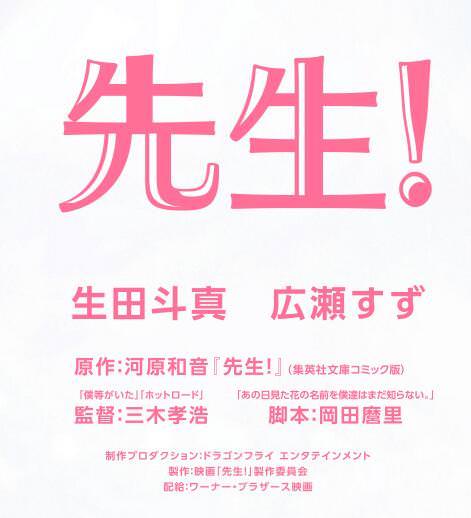曾經繪制過人氣漫畫《俺物語》和《青空呐喊》的作者河原和音近日又有一部漫畫《老師!》確定將拍攝真人電影啦!男女主角分別是生田斗真和廣瀨鈴,電影將在11月正式開拍,2017年秋季上映。