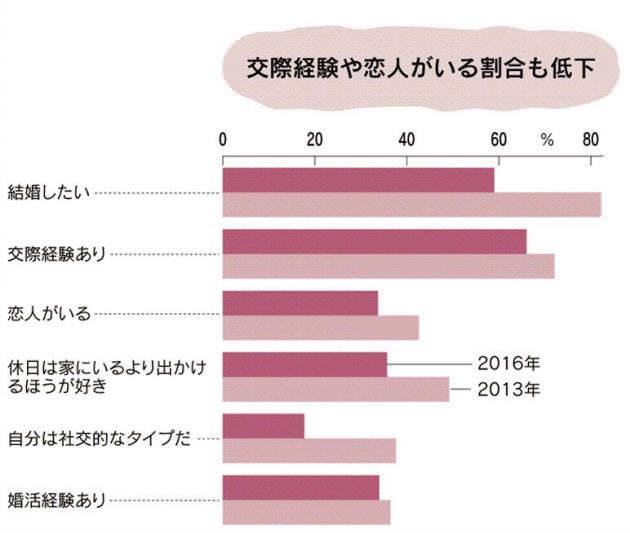 隨著貧富差距現象越來越嚴重,高工時與低薪的「社畜」越來越多,年輕人逐漸走向「三無世代」:找不到好工作、無力購屋置產,根本不敢結婚。根據之前的日本調查,70%未婚男性沒有交往對象,其中甚至超過4成是連性經驗都沒有的處男。「明治安田生活福祉研究所」日前公布對于「結婚、生產相關調查」的結果,目前在20代女性(20歲至29歲)中,僅有59%想結婚,比起2013年的調查結果,急遽減少了23.2%。