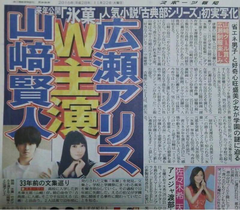 在今年 2 月底角川電影公布的 2016-2017 年作品路線圖中,《冰菓》和《春天與千夏》兩部角川旗下的小說宣布要改編成為真人電影,時隔數月,官方終于正式公布了《冰菓》的男女主角陣容。