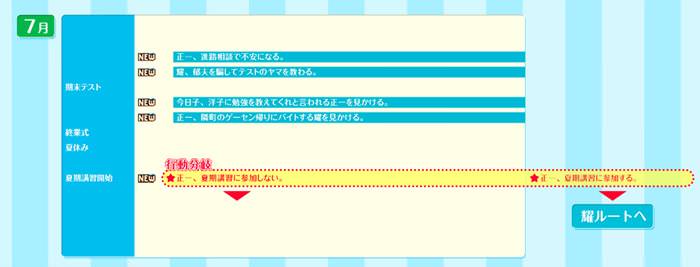 以4月入學為開始,戀愛事件從動畫第一話的時間7月開始更新,第一個分歧點出現在第一話結尾,正一參加了夏期講習則是進入了耀路線,這也正是第二話的內容。而如果男主沒有去則是進入其他路線,而究竟是誰的路線呢?實在令人好奇~