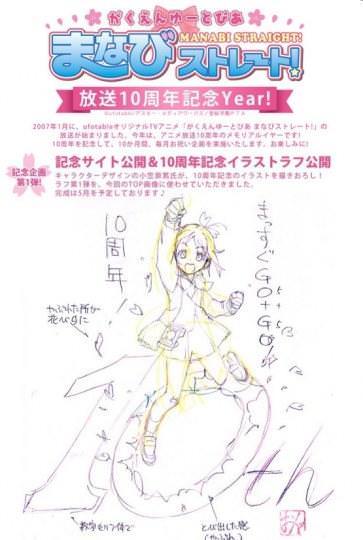 此次ufotable推出的10周年企劃為期長達10個月,期間每個月都將推出慶祝企劃。目前官方公布了紀念企劃第1彈為開放紀念網站,並公布10周年紀念插畫。該插畫由負責動畫角色設計的小笠原篤繪制,目前官方公布了這副插畫的草圖,該畫預定于今年5月完成。在這張草圖上可以看到動畫的女主角天宮學美一手握拳,單腳跳起的姿勢,一副干勁十足的模樣,她的腳下還有英文的10周年字樣,據悉這幅圖將作為官網首頁的插圖。其他關于紀念企劃的信息,目前暫未公布,騰訊動漫也將持續關注。