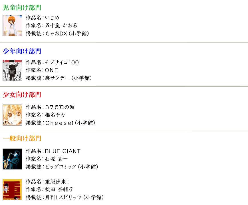 第62屆小學館漫畫賞于1月23日公開了各部門的獲獎名單。其中兒童向部門的獲獎作品是由五十嵐薰創作的《いじめ》,少年向部門的獲獎作品是ONE創作的《靈能百分百》,少女向部門的獲獎作品是椎名千花的《37.5℃的淚》。另外由石塚真一創作的《BLUE GIANT》和由松田奈緒子創作的《重版出來!》兩部作品獲得了一般向部門獎。另外,在2016年去世的創作過《小職員周記》等作品的高井研一郎被評為特別獎。