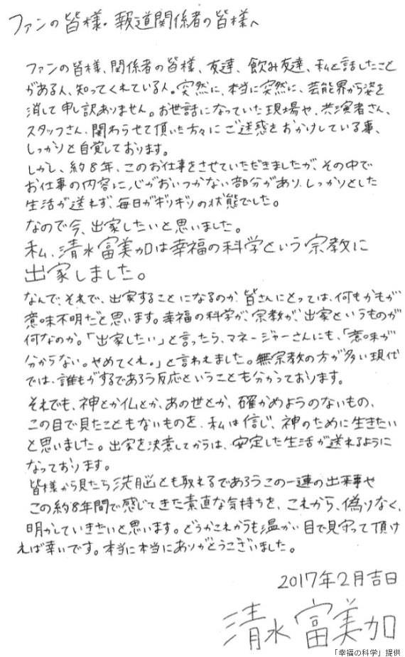 另外,“幸福科學”還公開了一封由清水富美加寫的相關信件。信上面寫有對廣大粉絲與相關人員的歉意,並表達了自己相信神等的宗教信仰。清水富美加表明這是她自己做出的決定,希望大家今後也能繼續關注著她。