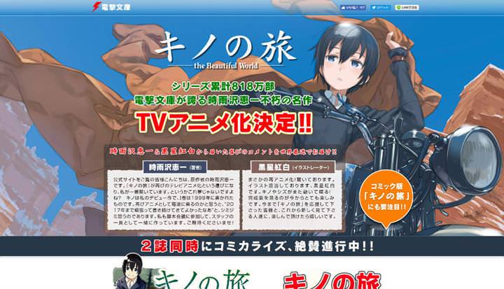 由時雨澤惠一創作的經典人氣輕小說《奇諾之旅》再次發表了TV動畫化的消息,悠木碧將為主人公奇諾配音,而齊藤壯馬將為艾魯梅斯配音。不過新作動畫的故事內容與大致的播出時間等均未公開。