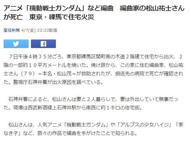 根據日本媒體的報道,為日本知名動畫《機動戰士高達》制作音樂的編曲家松山祐士于昨天(4月7日)下午在家中遭遇火災,不幸身亡,享年79歲。