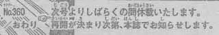 《黑街》的休刊比較特殊,改編為動畫後,動畫公司Manglobe破產了,動畫第三卷BD和以後的BD&DVD都由于制作上的原因不得不全部延期,至于何時發售以官方消息為准。漫畫也在同一時間段宣布休刊。今天,《黑街》漫畫宣布將在5月的雜志上重開連載。