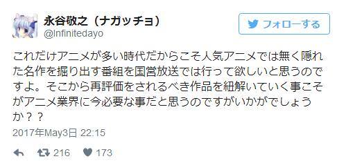 擔任株式會社infinite(負責過《Regalia三聖星》等作品企劃制作)代表董事的永谷敬之,在這個榜單發表後也發布了推特。其在推特上稱“在這個動畫作品眾多的時代,需要通過國家名義播出的應該是發掘被埋沒的名作的節目,而不是人氣動畫”。