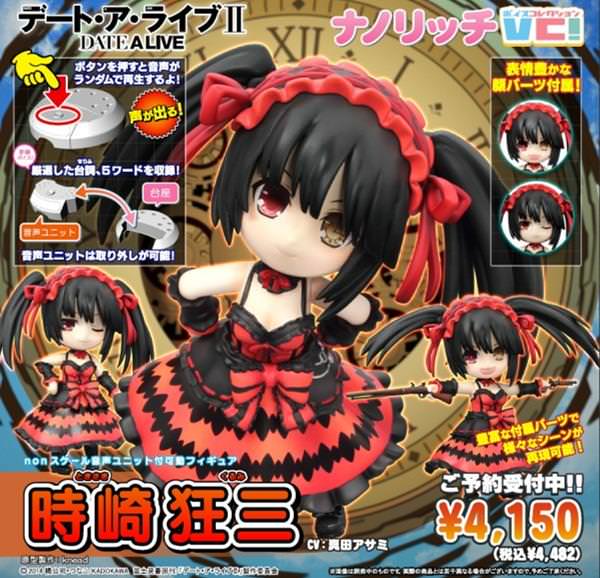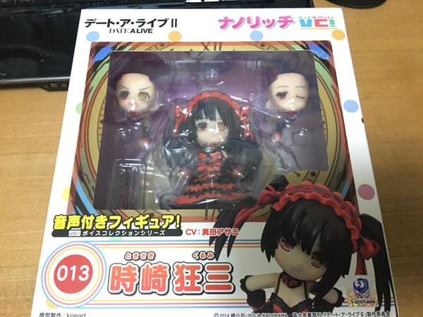 原定于2015年3月發貨的一款《約會大作戰2》中的“NanoritchiVC 時崎狂三”手辦在拖了兩年多的時間後終于發貨了。這款手辦的特點是帶有一個收錄了角色語音的台座,按下台座上的按鈕,就會隨機播放該角色的語音。