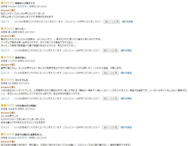 雖然等了兩年多,但看到自己喜歡的狂三終于來了的粉絲們還是十分高興的。不過當打開包裝想聽一聽久違了的狂三的聲音的時候,竟然發現雖然台座上寫有“Kurumi Tokisaki”,但實際上卻是四糸乃的聲音。目前在亞馬遜上,可以看到有不少顧客都遇到了這樣的情況。而且似乎還有顧客的台座中播放的是《刀劍神域》里的角色的聲音……