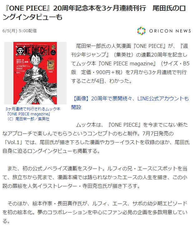 《海賊王》將在今年迎來連載二十周年,6月5日,官方公開了尾田榮一郎為《海賊王》二十周年紀念刊繪制的新封面,同時還宣布,這次的紀念刊將連續連載發行三個月。