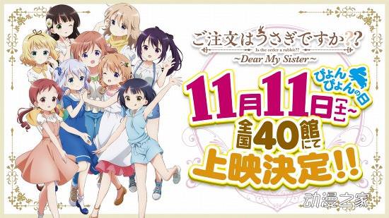 另外,根據同樣在芳文社Kirara系列雜志上連載的漫畫《請問您今天要來點兔子嗎?》改編的完全新作動畫《請問您今天要來點兔子嗎? ~Dear My Sister ~》也宣布了新的消息。本作將于11月11日這個日子,在日本全國40家影院上映。為紀念作品上映,在10月還將推出新角色歌CD。