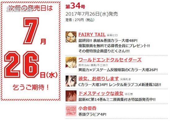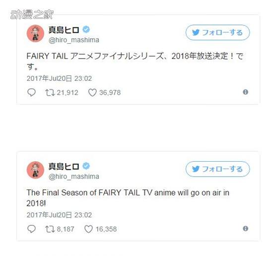 根據漫畫《妖精的尾巴》的原作者真島浩的推特消息,《妖精的尾巴》最後一部動畫作品將于2018年播出。另外,在次號發售的《周刊少年Magazine》上,原作漫畫將正式完結。