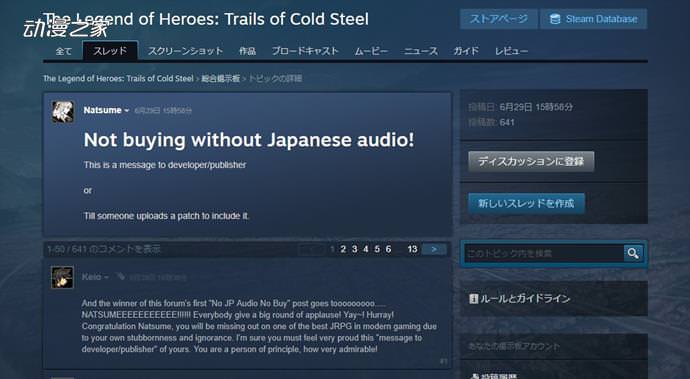 8月3日,人氣游戲《英雄傳說 閃之軌跡》在Steam平台上發售了。不過有玩家發現,本作游戲並沒有收錄日語語音。雖然目前已經有某家發了相關補丁,但沒有日語語音這一點依然讓不少玩家感到不滿。其中有一名名為“Natsume”的沙特阿拉伯玩家,更是公開表示沒有日語語言的話就抵制購買!