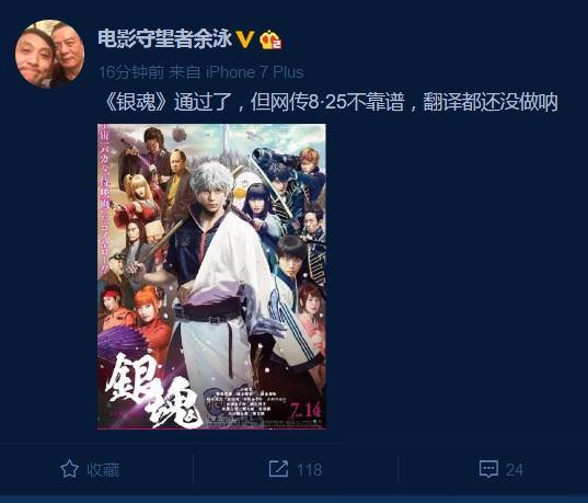 從圖片上可以看到,這是權威人士“電影守望者余泳”發布的消息。他表示:“《銀魂》通過了,但網傳8月25日不靠譜,翻譯都還沒做吶。”從這段話可以得到兩個信息,即我們未來是肯定能夠在電影院當中看到《銀魂》真人版的,但是想要趕在8月25日的時候上映,時間上恐怕來不及。那麼一來,可能就要錯過暑期檔了。