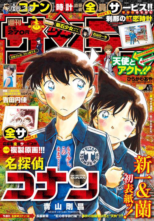在今天發售的《周刊少年Sunday》40號上,使用了青山剛昌創作的漫畫《名偵探柯南》中的登場人物工藤新一和毛利蘭作為封面。為紀念他們首次在封面中登場,官方還公開了一段新的宣傳視頻。