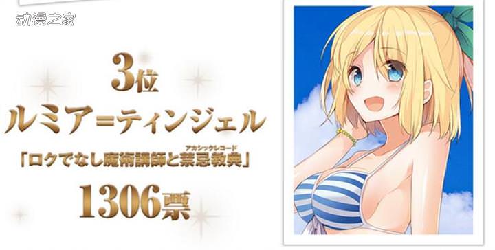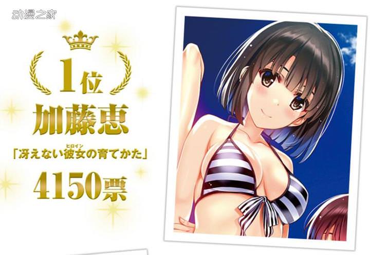 這次統計的是從投票開始到8月31日為止的得票情況,其中《路人女主的養成方法》中的加藤惠以4150票的成績排名第一。而之前同樣被看好的莉娜·因巴斯(秀逗魔導士)雖然排在了第二位,但得票數卻只有1949票。在《不正經的魔術講師與禁忌教典》中的露米婭·廷格爾以1306票的成績排名第三。