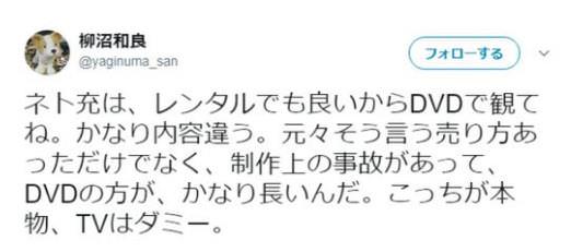 對于這樣的情況,有網友們認為這是變向圈錢。也有網友對導演說的制作事故的說法提出了質疑,認為既然放送時間與DVD發售時間差不多,那完整版應該也制作完了。那應該去更換放送的版本。