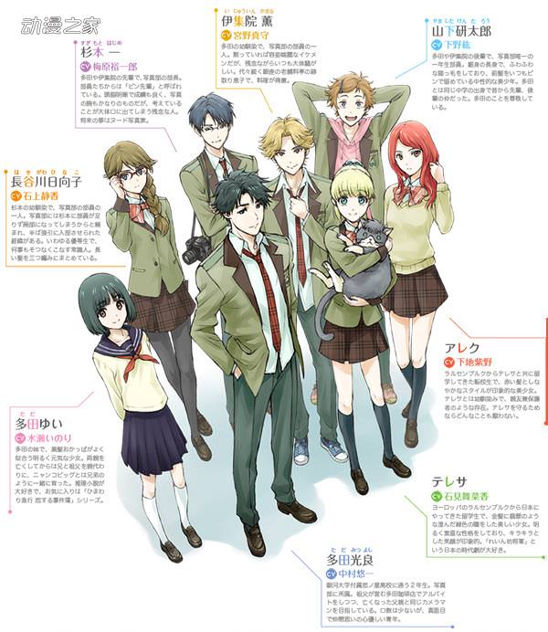 除了上面兩名角色外,光良的幼馴染伊集院薫(CV:宮野真守),與特里薩一起留學的亞曆珊德拉·瑪格麗特(CV:下地紫野),寫真部部長高三年級的杉本一(CV:梅原裕一郎),杉本一的幼馴染長谷川日向子(CV:石上靜香),寫真部的唯一一名高一年級部員山下研太郎(CV:下野紘),光良的妹妹唯(水瀨祈)等角色也將登場。