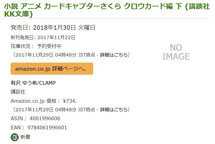 漫畫版《魔卡少女櫻庫洛牌篇》被講談社旗下的KK文庫改編為小說版。預計2018年1月30日發售,售價734日元(約合43元人民幣),由沢ゆう希將負責執筆。