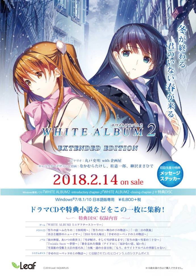 《白色相簿2》明年情人節發售,leaf官方宣布,《白色相簿2》「WHITE ALBUM2 EXTENDED EDITION」確認將于 2018 年 2 月 14 日發售,這個版本為補完短篇和本篇游戲整合的版本。