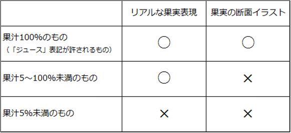 在日本,雖然生活中常把包括碳酸飲料在內的不少飲料都稱為“ジュース(juice)”,但根據日本的公平競爭條約和景品表示法等的規定,只有100%的純果汁才能在商品名上表明“ジュース”這個詞。除了只添加食用鹽的番茄汁以外,其余所有非100%純果汁的飲料,不得在包裝上使用“ジュース”這個詞,也不得出現寫實風格的水果的斷面圖。另外,果汁含量在5%至不滿100%的飲料,可以在包裝上使用水果的整體圖案。而果汁含量不足5%的飲料連水果的整體圖案都不得使用。