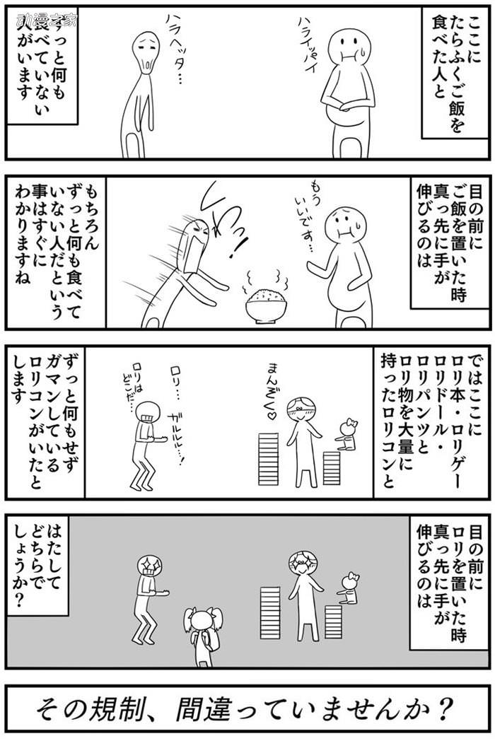 近日,從事手繪圖片與制作視頻的畫師夏川光在推特上發布了一張圖片,表示了對規制蘿莉物的反對意見。在漫畫中,稱性欲就類似吃飯,將一碗飯放在一直都吃的飽飽的人和一直餓著肚子的人前面,肯定是餓著的人先伸手。同理,如果將一個現實中的蘿莉放在一個有著大量蘿莉類的書、游戲、娃娃、胖次的蘿莉控和一個一直只能忍耐的蘿莉控面前,又會是怎樣的結果呢?
