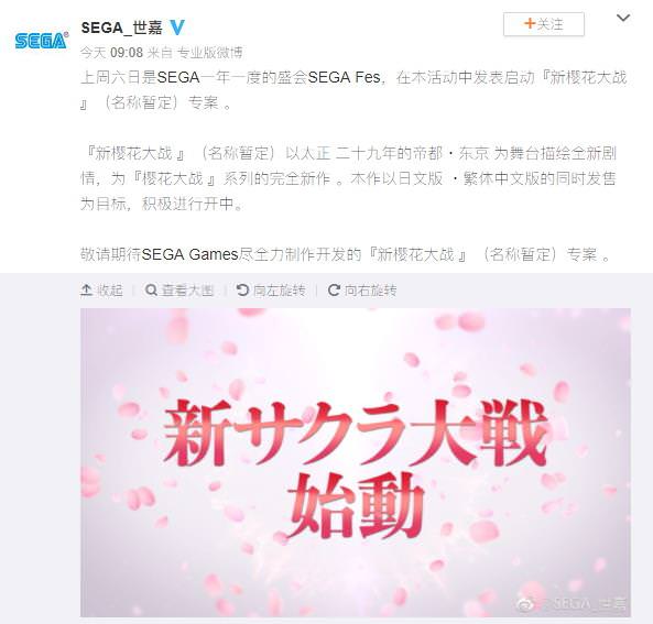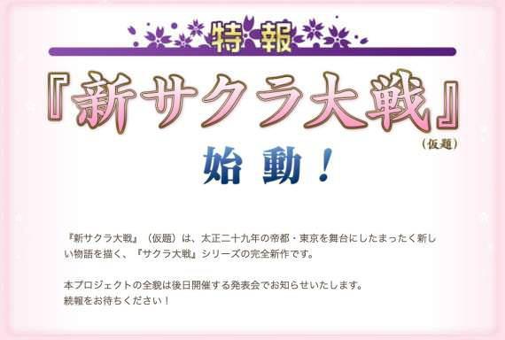 今天世嘉官方微博宣布,他們將啟動《新櫻花大戰》(名稱暫定)專案,將以太正二十九年的帝都?東京為舞台描繪全新劇情,為《櫻花大戰》系列的完全新作,並將以“日文版·繁體中文版的同時發售為目標”。