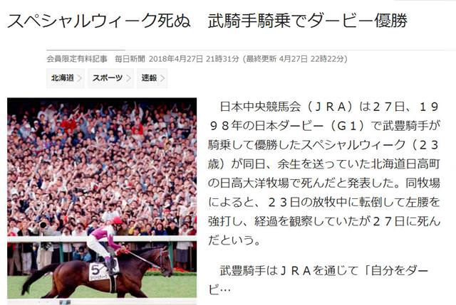 動畫《馬娘》主人公特別周原型賽馬去世