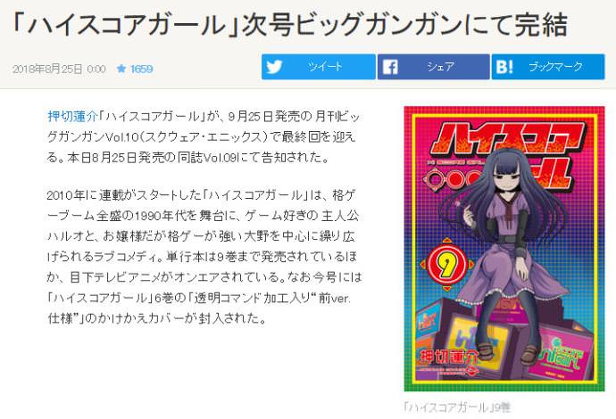 熱播中7月新番動畫《高分少女》近日公布消息,《高分少女》漫畫下月完結,將于9月25日發售的「月刊BIG GANGAN」上刊登最終話 。《高分少女》曾在發行的第九卷漫畫單行本上公布本漫畫將在第十卷完結,此次終于公布了漫畫連載最終話的准確時間。