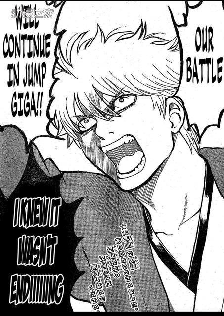 根據偷跑消息,之前宣布將要完結的漫畫《銀魂》,將要在月刊《Jump GIGA》上繼續連載。從圖片上可以看出,有“我們的戰斗將在GIGA上繼續”的台詞。另外在網傳的空知老師的感謝信中,也提到了故事沒有完結。不過日文部分寫的卻是敬請期待空知老師的次回作品。