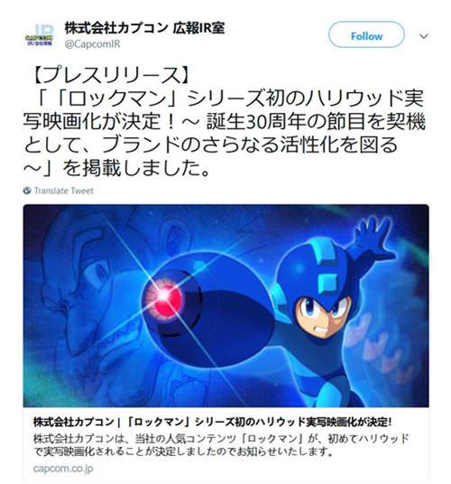 卡普空宣布《洛克人》系列改編好萊塢真人電影決定