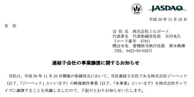IG Port在本日(20日)舉辦的董事會上,宣布將社內公司株式會社XEBEC的映像制作事業轉讓給株式會社SUNRISE。